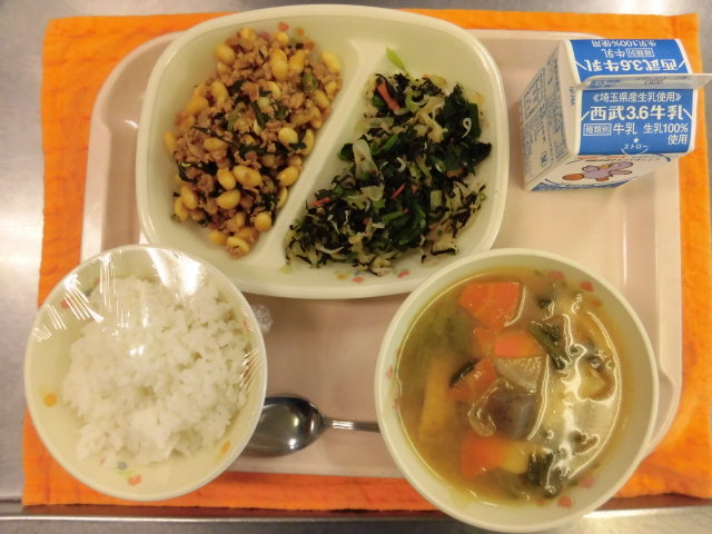 絵文字:食事 給食牛乳・ソイ丼・磯の香和え・野菜椀絵文字:食事 給食