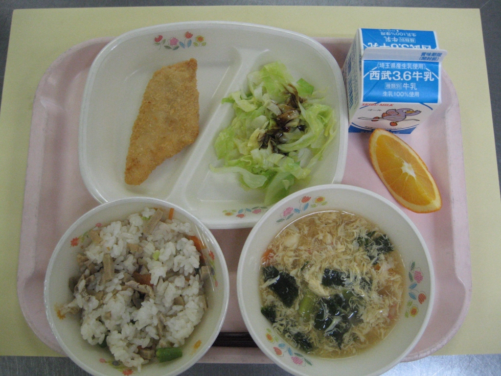 牛乳・かてめし・鮭のチーズフライ・茹でキャベツ・かき玉汁・オレンジ