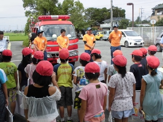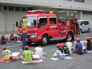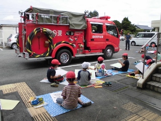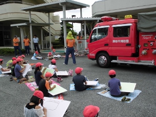 3年生は、地元第9消防団の皆さんにご協力いただき、学校に消防車をもってきていただき、消防車を描きました。