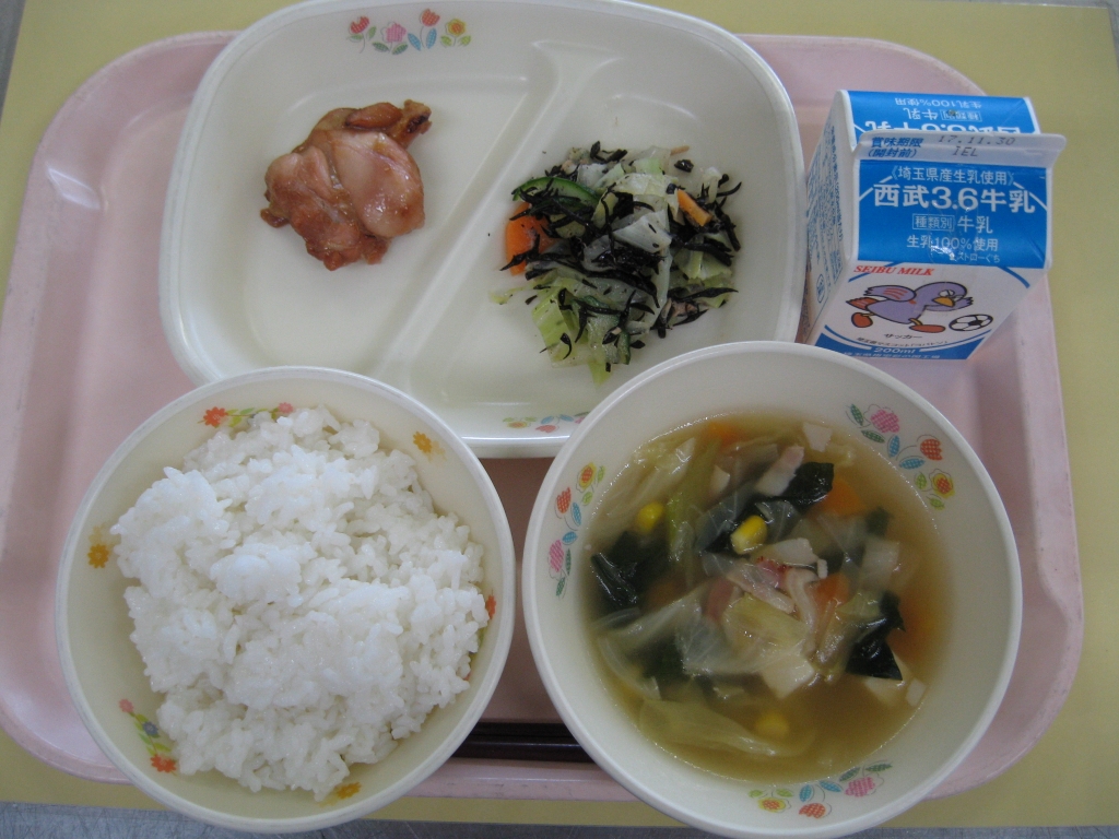 牛乳・ごはん・鶏の照り焼き・ツナとひじきのサラダ・野菜コンソメスープ