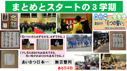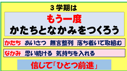 ・・この3学期は最後のまとめと次の学年への準備をする大切な学期です。「まとめとスタートの3学期」について少し説明します。今学期の合い言葉「もう一度かたちとなかみをつくろう」としたのは昨年、子どもたちの指導を通して学びました、先生方がわかったつもりでも、時と場合によりもう一度指導が必要なことがたくさんありました。一つは「かたち」をつくる取り組み、例えば「無言整列、無言登下校」「あいさつ日本一」などを通して、子どもたちが落ち着いて取り組むことにつながることがわかりました。もう一つは「なかみ」をつくる取り組み、どんなときも「気持ち」を入れて取り組むことの大切さを実感しました。卒業生の中林先生から「思い続けることの大切さ」、人権集会等から全ての人が「しあわせ」を感じるために思いやりの行動の大切さ、親善運動会の長縄跳びでは気持ちを一つにする大切さ・・大事なときこそ気持ちの持ち方がいかに大事か実感しました。 今年の箱根駅伝で優勝した東海大学からも学びました。監督は「ずっと悔しい思いをしてきたが、優勝に向かってあきらめずにやってきた結果」が成果につながったという話をしていました。これから始まる3学期、いろいろな場面で「気持ち(なかみ)」を入れて取り組むと良い成果(ひとつ前進)につながると信じています。 ※左にありますメニュー「学校だより」をクリックしますとご覧になれます。