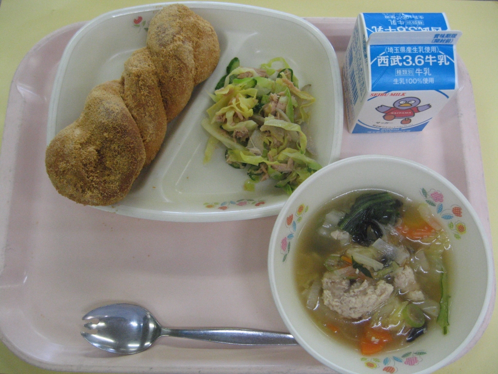 牛乳・きなこ揚げパン・ヘルシーサラダ・白菜と肉団子のスープ
