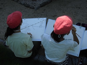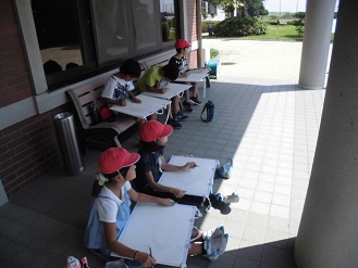 5年生が写生会で大寄公民館に移築されている渋澤栄一翁に関係する誠之堂を描きました。真夏のような暑さの中、1時間、頑張って下絵を仕上げていました。子どもたちは、誠之堂を思い思いの方角から眺め、自分の場所を決めていました。この後、どんな作品に仕上がるか楽しみです。