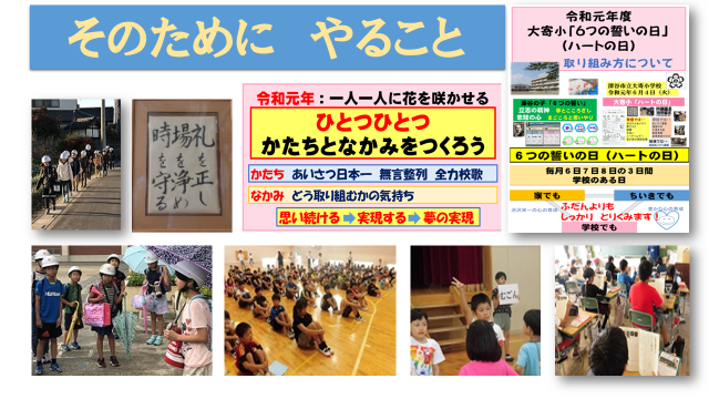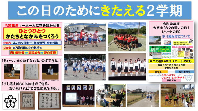 いよいよ80日間の2学期がスタートしました。この2学期は「実りの秋」「充実の2学期」といわれます。学校では、たくさんの行事もあり、一つ一つの行事を全力で取り組ませ、「一人一人に花を咲かせる」ことを願っています。2学期は「なかみをきたえる」「この日のために」「そのためにやること」を合い言葉に、職員全員が子どもと寄り添い家庭と連携しながら確実に子どもたちに力を付け、変容させたいと考えています。今学期も「チーム大寄」学校・保護者・地域が一体となり子どもの成長のためにご理解とご協力を何卒よろしくお願い致します。