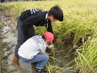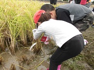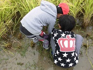 1年生は初めての稲刈りでした。今日は、5年生に優しく声をかけてもらいながら,稲を刈りました。