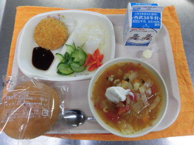 絵文字:食事 給食牛乳・メンチカツバーガー・ボルシチ・彩りサラダ絵文字:食事 給食