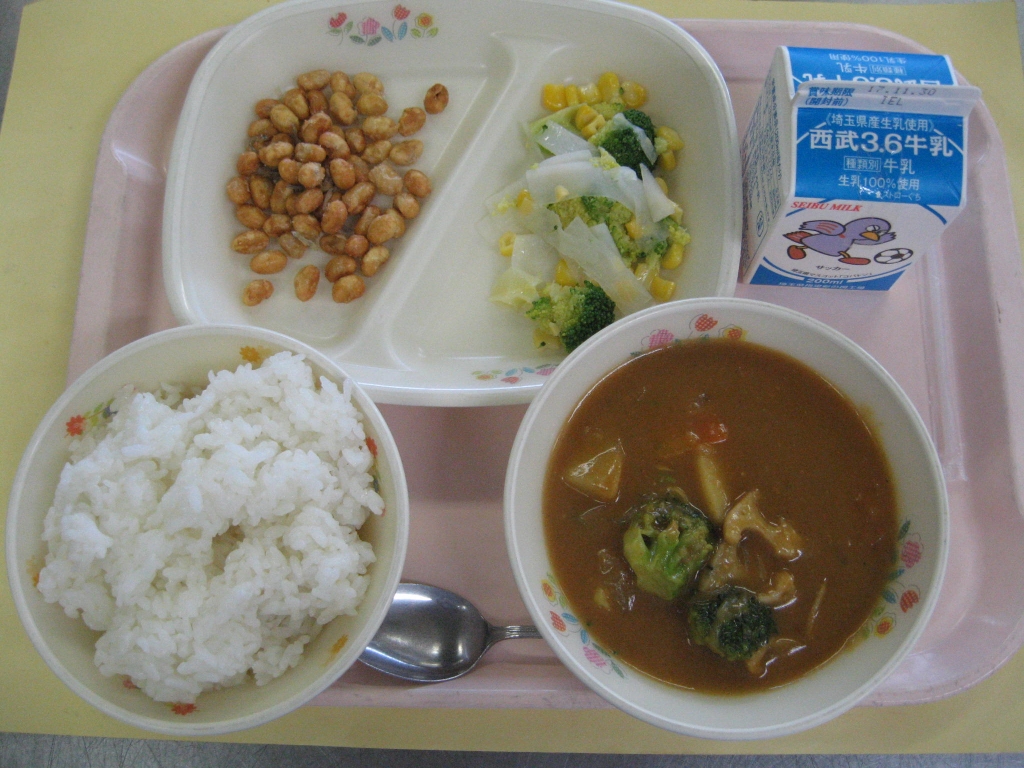 牛乳・冬野菜のカレーライス・大豆と小魚のカリカリ揚げ・ブロッコリーとコーンのサラダ