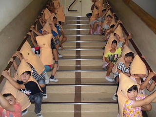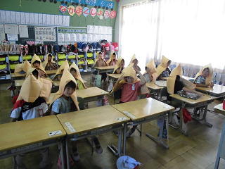 窓とカーテンを閉め、防災ずきんをかぶって、静かに放送を聞きます。