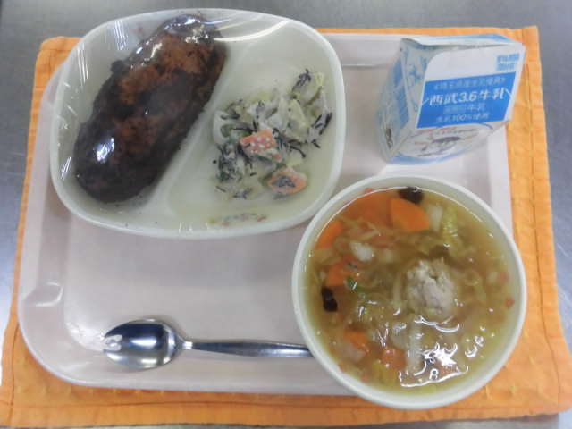 絵文字:食事 給食牛乳・ココア揚げパン・彩の国サラダ・白菜と肉団子のスープ絵文字:食事 給食